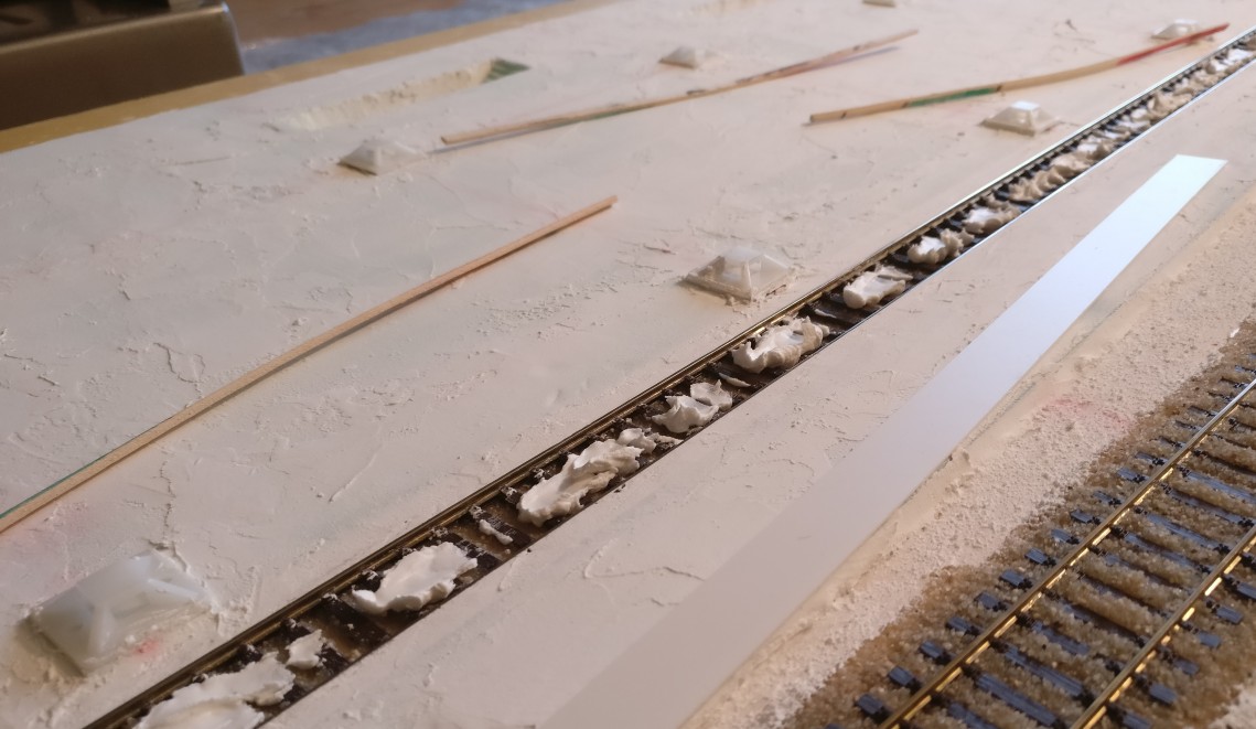 Der Streifen Plastic Sheet ist leider nicht verwindungssteif. Bis zum Abbinden der Innenspachtelmasse müssen Abstandshalter zwischen Streifen und Gleisprofilen dafür sorgen, dass ein Schlitz für die Räder der Güterwaggons freigehalten wird.