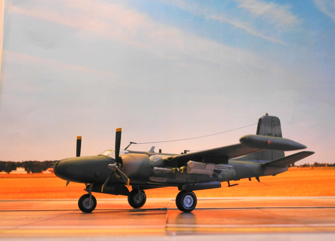 Manchmal stirbt dann der Nimbus eines Flugzeugs einen ruhmlosen Tod. Nicht so die Douglas A-26 „Invader“. Je mehr ich über dieses Flugzeug und seine wechselhafte Geschichte zu wissen bekam, desto größer wurde das Interesse, zumal es mit der B-26K „Counter Invader“ sogar eine modernisierte Version gab. Mit dem Rufzeichen „Nimrod“ flogen diese Maschinen Nachteinsätze über Vietnam. Als Italeri dann seine B-26K „Counter Invader“, Bausatz Nr. 1249 herausbrachte, konnte ich mich endlich ans Werk machen. Den alten Airfix-Bausatz von 1975 hätte ich mühselig umbauen müssen, während der Italeri-Bausatz von vornherein die für den Vietnam-Krieg modernisierte Version darstellt.