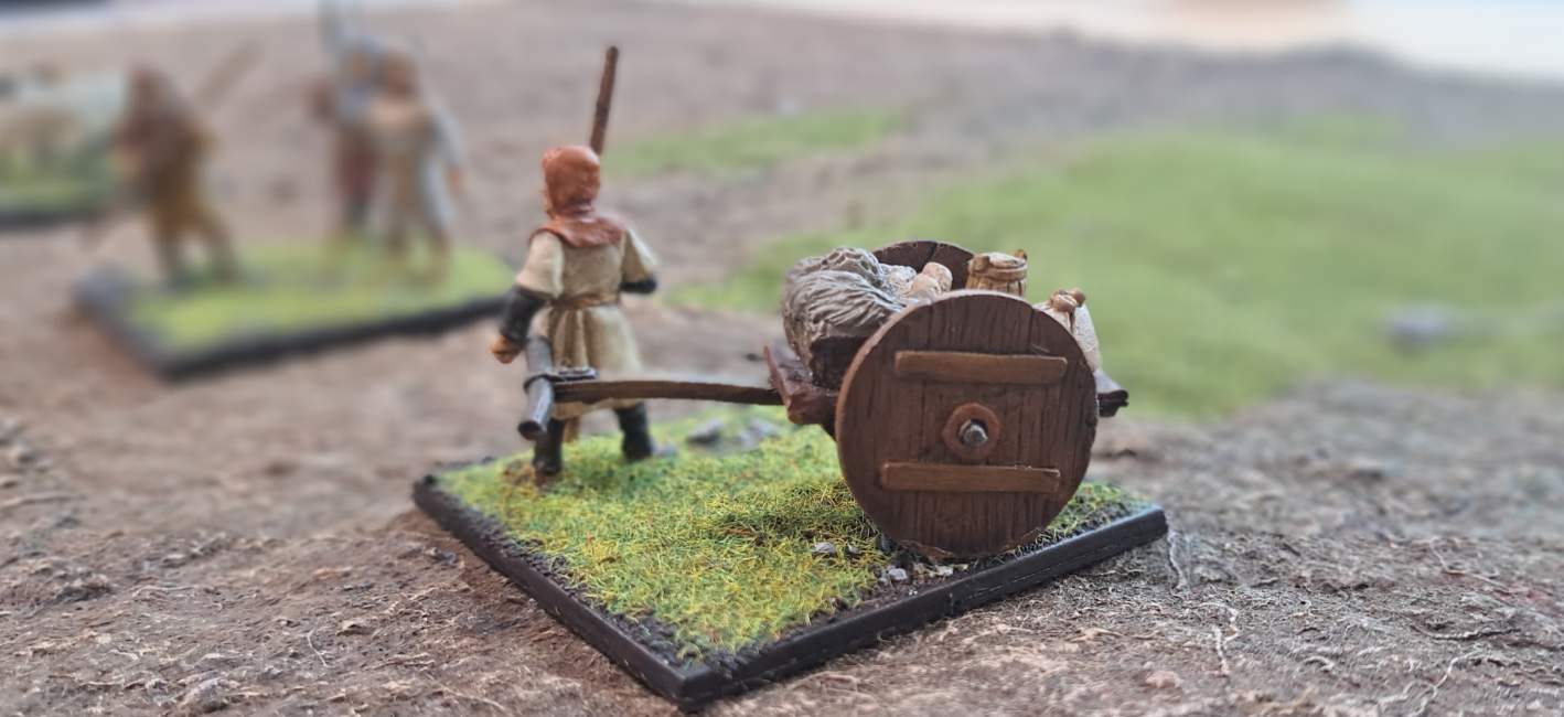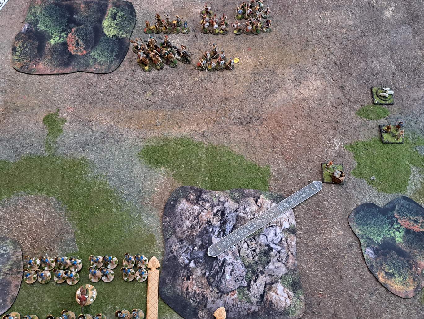 Als Szenario für das Spiel wählten die beiden Sofageneräle „Hinterhalt“ aus dem SAGA-Buch der Schlachten. Dieses Szenario ist insofern sehr interessant, als nicht primär der Kampf der Spieler gegeneinander, sondern eher der Kampf beider Spieler gegen drei vorbeiziehende Planwagen angesagt ist. Diese Planwagen bewegen sich von einer Tischkante quer zur Sicht der Spieler zum gegenüberliegenden Spielfeldrand. Ziel ist es, die Wagen aufzuhalten, zu erobern und als Beute zu sichern. Das Erobern erfolgt recht martialisch durch einen klassischen Angriff auf die recht zähen Planwagen. Diese haben Rüstungswerte von 5 im Nahkampf und von 6 im Fernkampf. Da muss man also schon ganz schon draufhalten. Zudem haben die Wagen Zähigkeit(1) und neigen dazu, bei jeder Bewegung ihre Ermüdungsmarken zu verlieren…