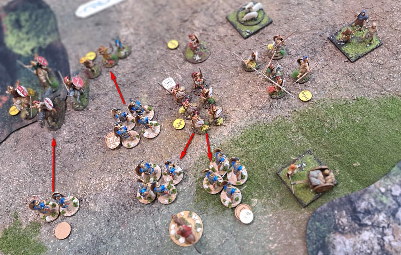 Die nahenden Reitertruppen und die Bogenschützen entdeckte Sturmi als wohlfeile Beute. Mit der SAGA-Sonderfähigkeit „Quincunx“ schickte er zwei Veteraneneinheiten rüber und biss sich durch Reiter (3 Verluste) und Bogenschützen (5 Verluste). Kurz darauf kam es zum zweiten Gefecht und es starben weitere 3 Reiter und die gesamten Bogenschützen.