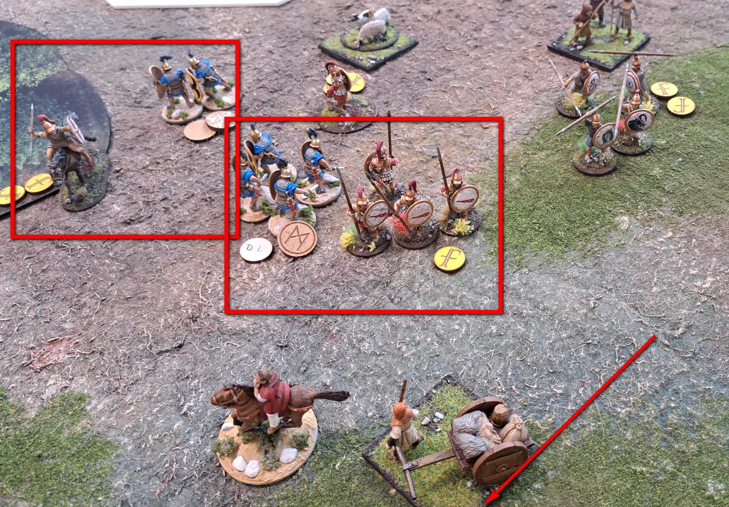 Sturmis Veteranen hatten sich entlang des Weges der Planwagen aufgestellt und lauerten ihrer Beute auf. Das nahm Björn zum Anlass, seinerseits Reiterei und Bogenschützen in gleicher Weise in Stellung zu bringen. Seine Veteranen und eine Kriegereinheit stellten sich sogar den Planwagen in den Weg, um eine Weiterbewegung zu verhindern.