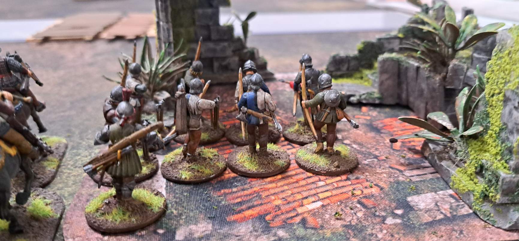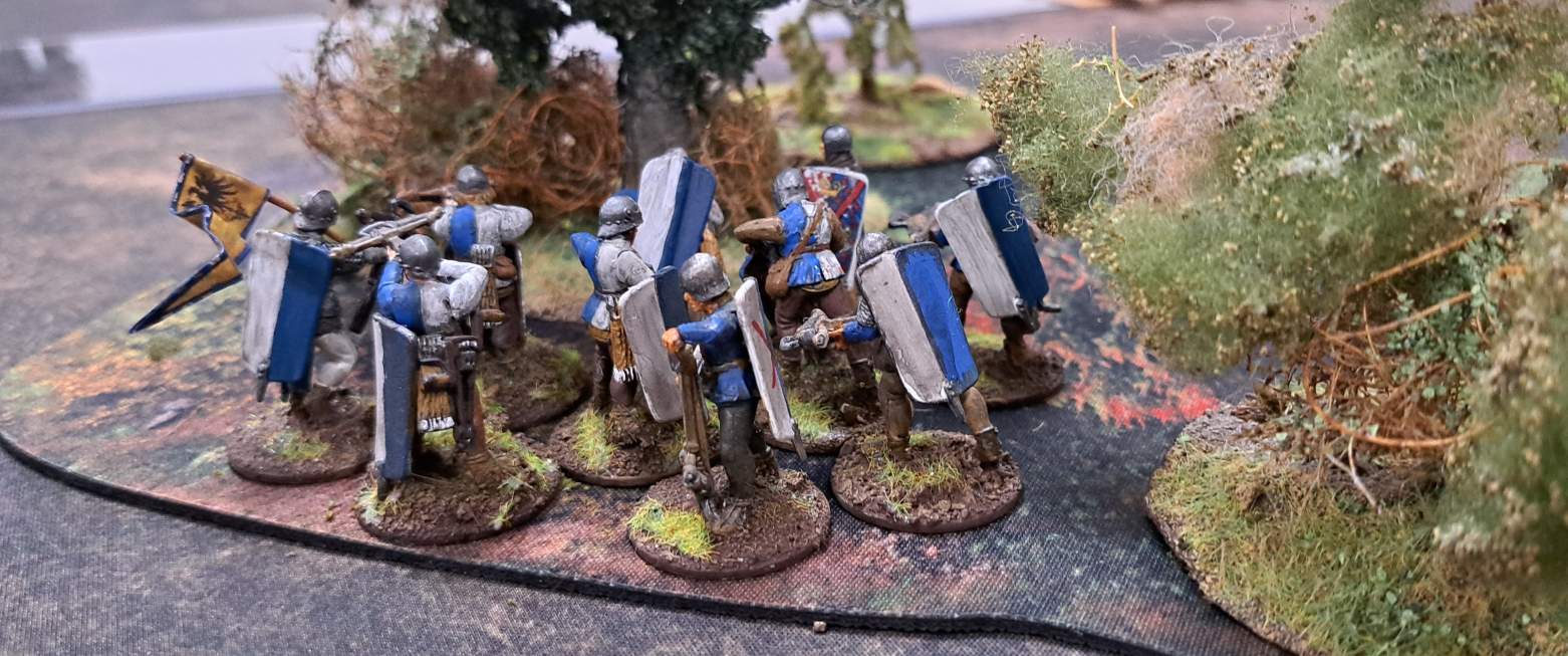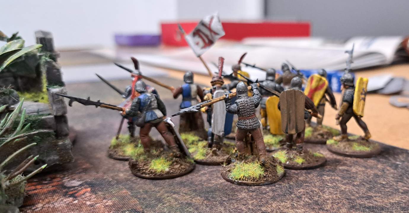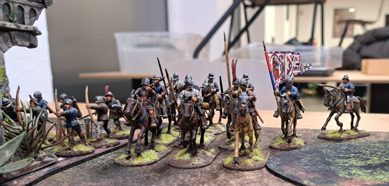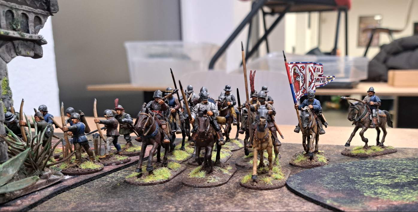 Ralf stellte sich entsprechend auf: Übergänge sichern, Feuerlinien aufbauen, alles schön burgundisch ordentlich. Links Bogenschützen und Fußvolk an einer Ruine gegenüber der Furt, rechts viel Fußvolk plus Veteranen – und irgendwo lauerte auch noch die Armbrusttruppe.