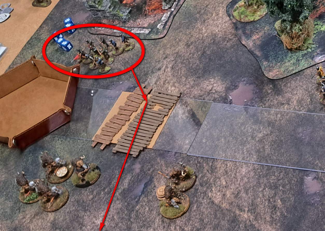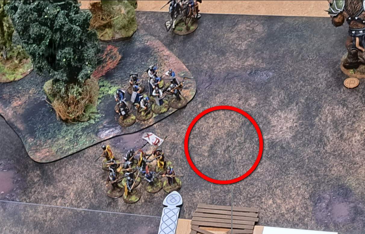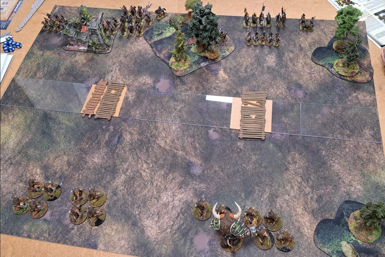 Auf meiner linken Flanke standen vier Kreatureneinheiten an der Furt. Lange war dort kaum Bewegung. Ralf stichelte mit Bogenschützen aus der Deckung heraus – aber gegen Minotauren ist „Pfeilchen pieksen“ eher so mittel beeindruckend. Unsere SAGA-Würfel und Aufmerksamkeit steckten klar im anderen Flügel.