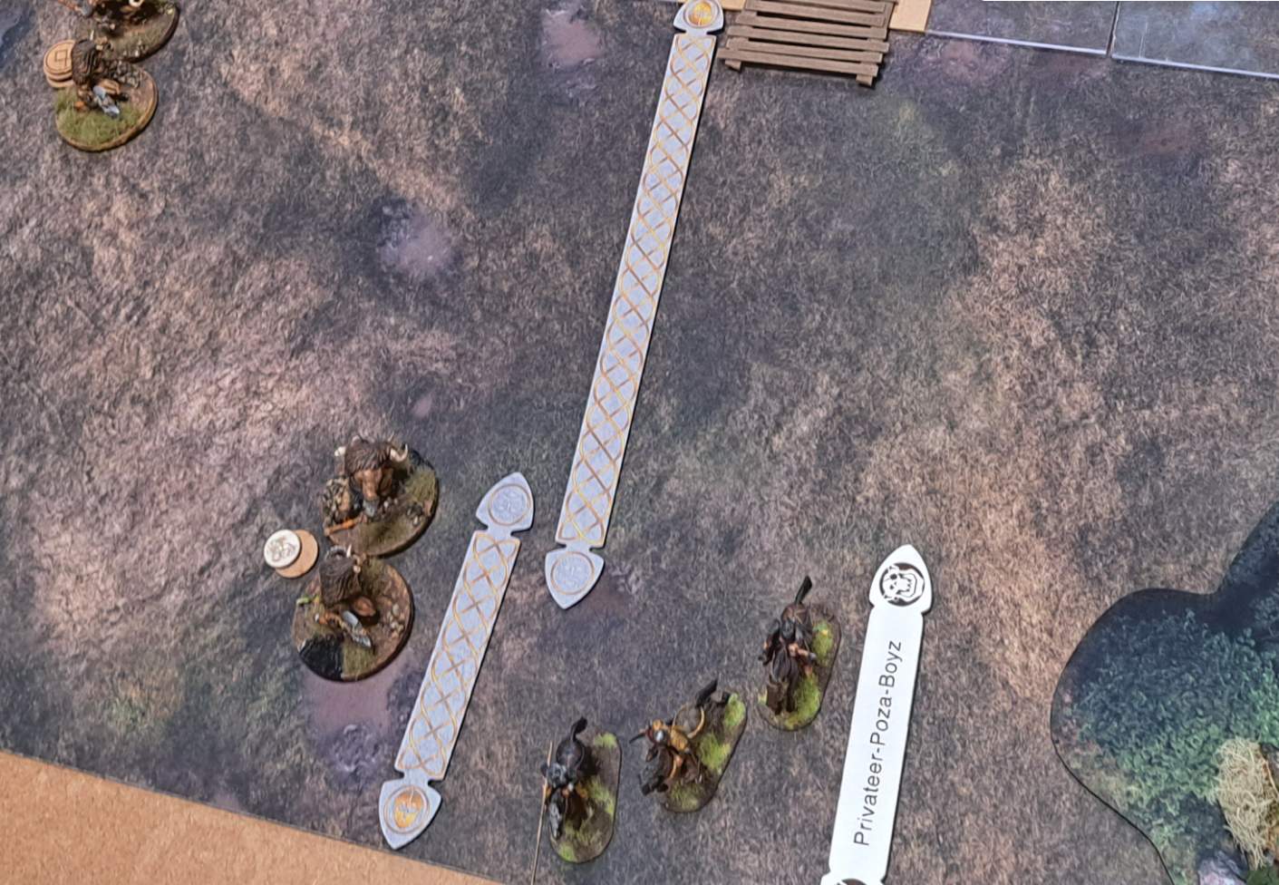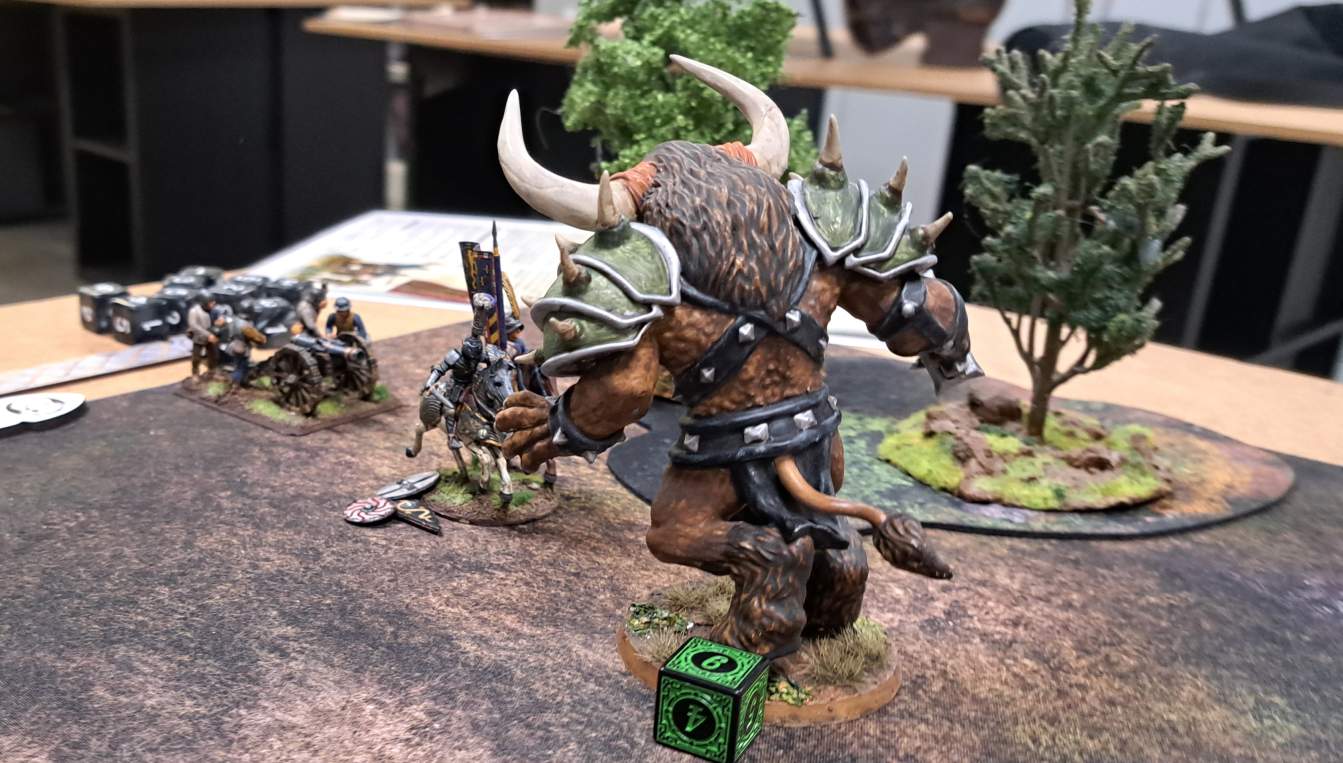 Ich spielte Minotauren mit dem Battleboard der „Herrscher der Wildnis“. Fokus: Zweikampf suchen, Druck machen, kloppen, bis es nach Siegpunkt riecht. Und dann war da noch diese nette Gemeinheit des Battleboards: Geländestück animieren – wenn man mit einer eigenen Einheit nahe genug drankommt. Als ich das erwähnte, war bei Ralf sofort Unruhe im Blick: Das Kopfkino lief. „Was, wenn da plötzlich so ein Titan mit Stärke 12 aus dem Wald steigt?“