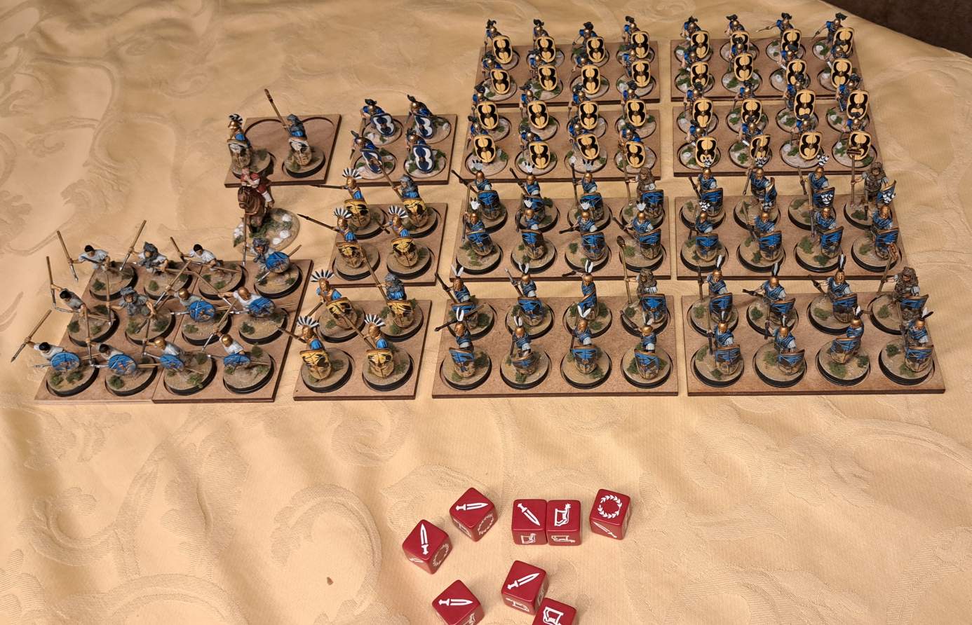 Die Krieger plane ich ohnehin nicht für den Kampf ein. Der soll nur von Veteranen geführt werden, weil dort die Vorzüge des Battle Boards voll zum Tragen kommen. Der Split der 8er Krieger Einheiten in 4er Krieger Einheiten dient nur der Sicherstellung der generierten SAGA-Würfel. Aus diesem Grund habe ich auch den Tribun als Kriegsherrn gewählt, da er zwei Einheiten mit „Folgt mir!“ aktivieren kann. Zudem kann seine Kampfkraft von nur „2“ per Battleboard um 4 erhöht werden, so dass er stärker eingreifen kann.