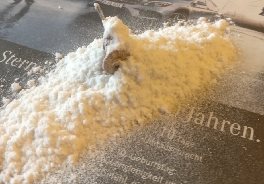 Hier die große Schneefläche auf der Base. Der PONAL glänzt noch. Nach dem Aufstreuen des Modellbahnschnees muss der PONAL gut durchtrocknen.
