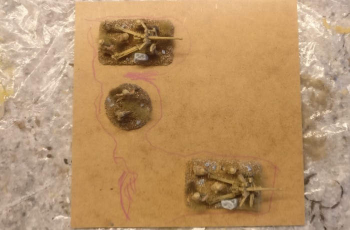Zum Pröbeln nahm ich mir vor, einen deutschen und einen britisch besetzten Sangare herzustellen. Also packte ich mal gleich je drei deutsche und britische Einheiten aus der PBI-Kiste auf zwei Terrain Tiles. Es wirkte auf ich nicht übel. Mit Buntstift zeichnete ich die Konturen des späteren Sangar auf, so dass ich die Foot Groups für die grobschlächtigen und schmutzigen Arbeiten wieder entfernen konnte.
