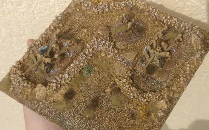 Im Sangar selbst würde ich nur groben Vogelsand aufbringen. Die Foot Groups sollen ja eher tief liegen. Die Brustwehr jedoch sollte aus grobem Aquariumkies und kleineren Zierkieseln entstehen.