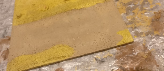 Die Konturen der Straßen habe ich wie bei dem Bild des Expansion Pack 1 von Sarissa aufgezeichnet und fülle nun die „Wüsten“-Teile mit Strukturpaste, die später das Geröll aufnehmen soll.