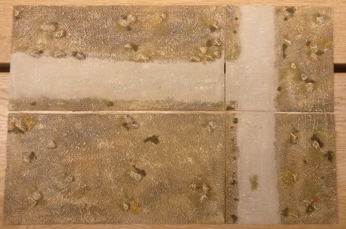 Alle vier Terrain Tile Module nach dem Trocknen. Die Straßenführung ist wie beim Beispielfoto des Sarissa Terrain Tile System Expansion Pack 1 gehalten.