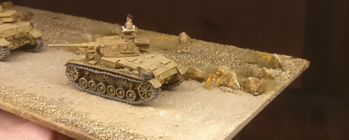 Die Terrain Tile Module kann man auch solo einsetzen. Hier tummeln sich ein Panzer III, ein Panzer IV Ausf. F2 und ein Kübelwagen in Nordafrika auf der Rollbahn.