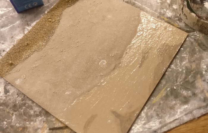 In der Zone „Sand“ gebe ich vor dem Aufstreuen des Chinchilla-Sandes einige Krümel groben Vogelsand drauf. Das werden später hervorstechende Steine werden, welche die manchmal etwas langweilig glatte Oberfläche des Sandstrandes aufbrechen und unruhig aussehen lassen.