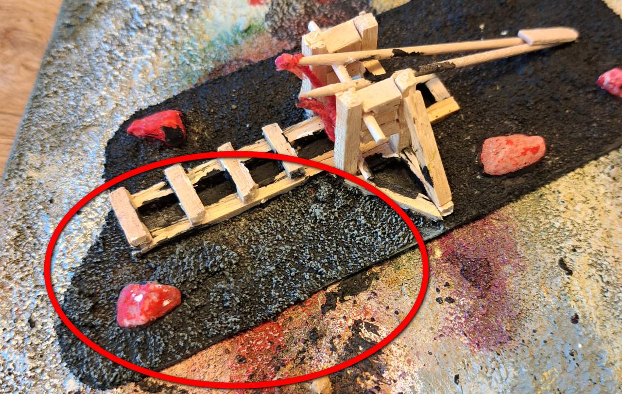 Der Hebelarm und die Winden sind mit "Lederbraun" gewasht. Sie heben sich angenehm vom Rest des Schädelkatapults ab.