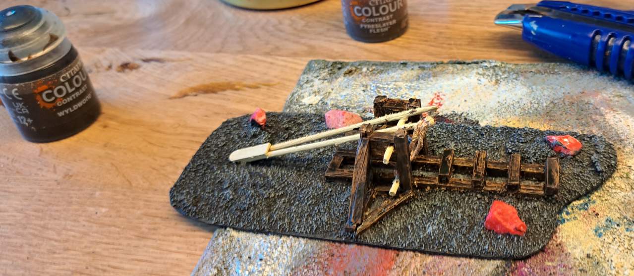Den Wurfarm und die Teile der Winde überziehe ich sodann mit dem Wash aus Lederbraun. Für den Wollfaden (das „Seil“) nehme ich Contrast Colour Fyreslayer Flesh.