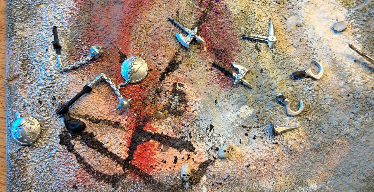 Von meinen letzten Chaos Barbaren hatte ich noch eine Menge Ausrüstung übrig: Schilde, Äxte und … zwei Totenschädel.
