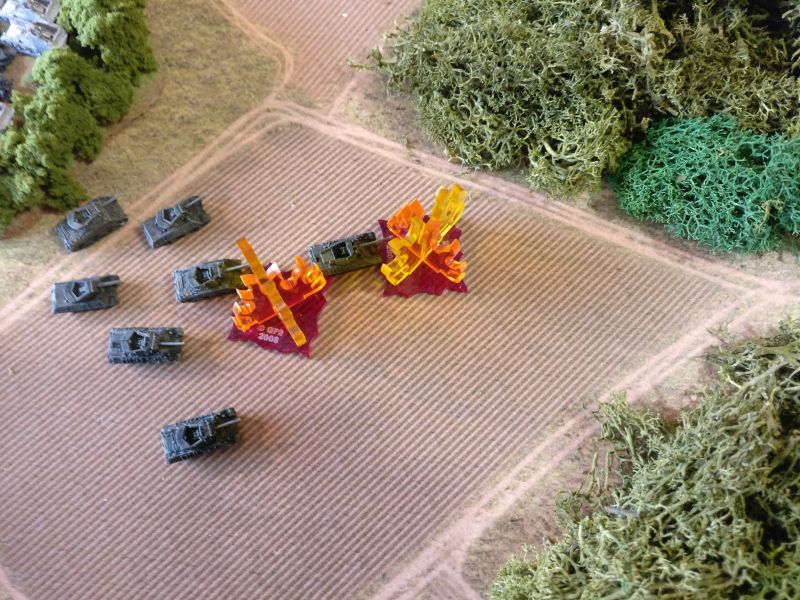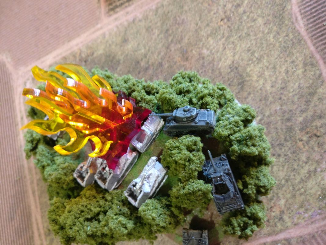 Der Feuerschlag der Hummel-Batterie sitzt. Zwei der vier US Tanks gehen in Flammen auf.