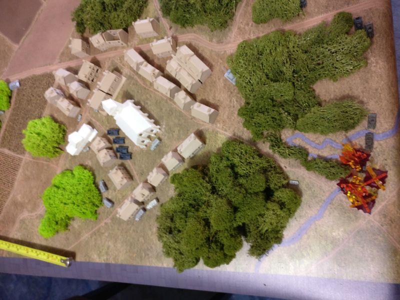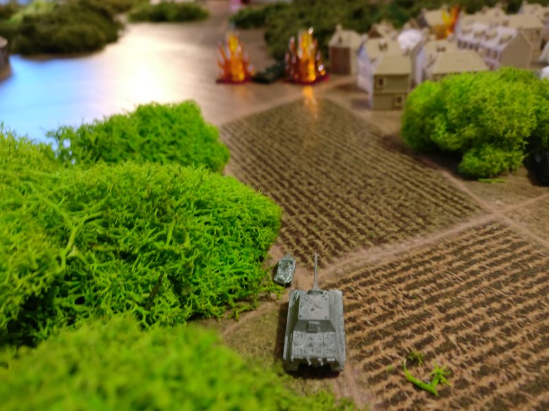 Der eisame Tiger I hat seinen vier gegnern den Garaus gemacht. Doch jetzt fehlt es ihm an Zielen. Das anstehende Gefecht am rechten Ortsausgang von Taverneux wird wohl ohne ihn stattfinden müssen. Der Weg dorthin ist weit.