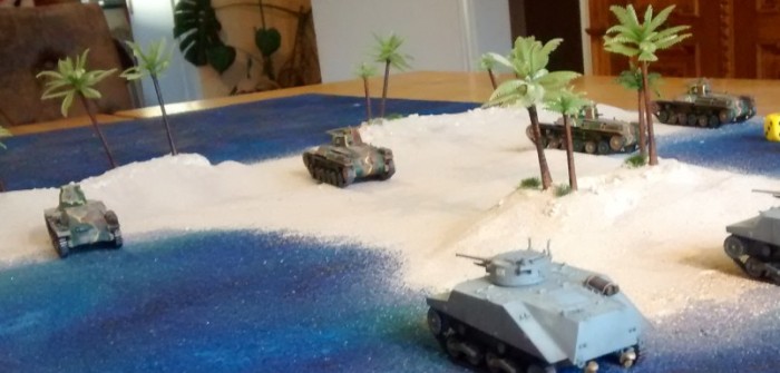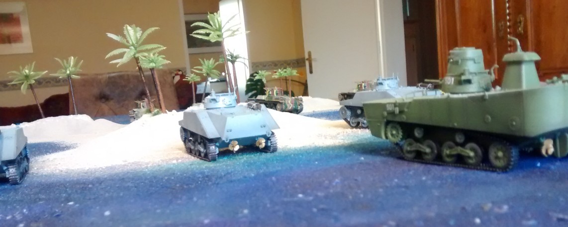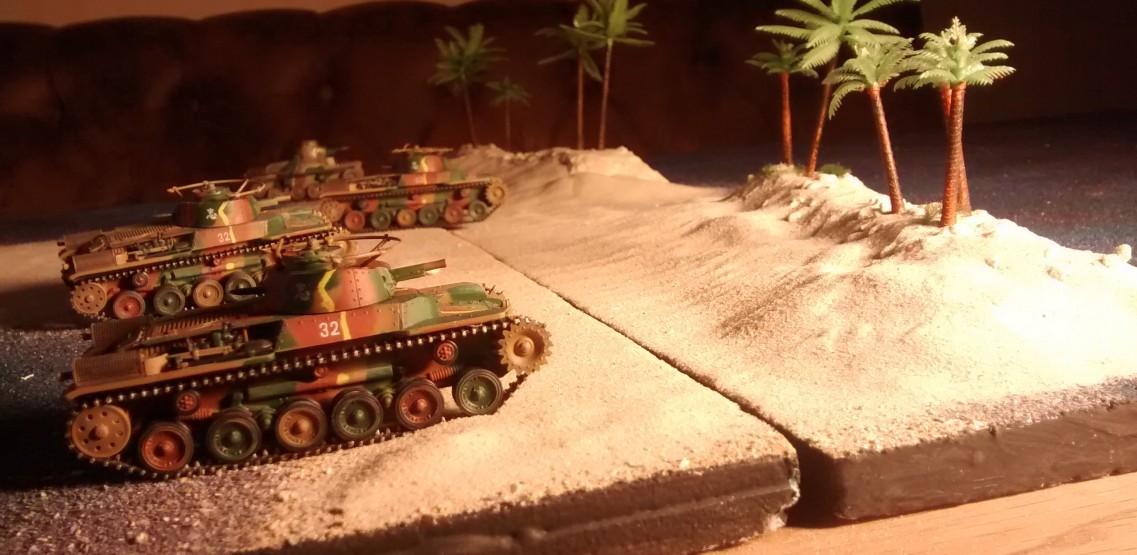 Prototyp der bespielbaren Dioramenplatte "Schlacht um Wake Island" mit beispielhaft aufgestellten Typ 97 Chi-Ha,  Type 95 Ha-Go, Type 2 Ka-Mi mit und ohne Ponton