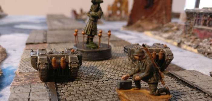 Am vergangenen Samstag nutzte ich die Gelegenheit, auf dem PBI-Con in Wuppertal die frisch bemalten Sd.Kfz. 309 „Assel“ einmal auf den dortigen Spielplatten in den Einsatz vor die Linse zu schicken. Gerade die winterliche Stadtplatte ( gefühltes „Stalingrad“) bildete den Einsatz bei der 14. Panzerdivision perfekt ab.