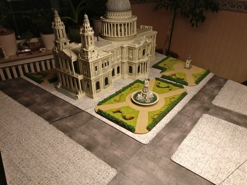 Montag mittag habe ich die Plattensegmente beim Plasti abgeholt. Er hatte die Endmontage und die Gestaltung der Grünanlagen übernommen. Ich glaube fast, er hat echt einen grünen Daumen. Bei Saint-Aubin-Sur-Mer hat er schon den schönsten Rosengarten aller Zeiten gezaubert und jetzt hat er sich rund um das Landeshaus nochmal übertroffen.