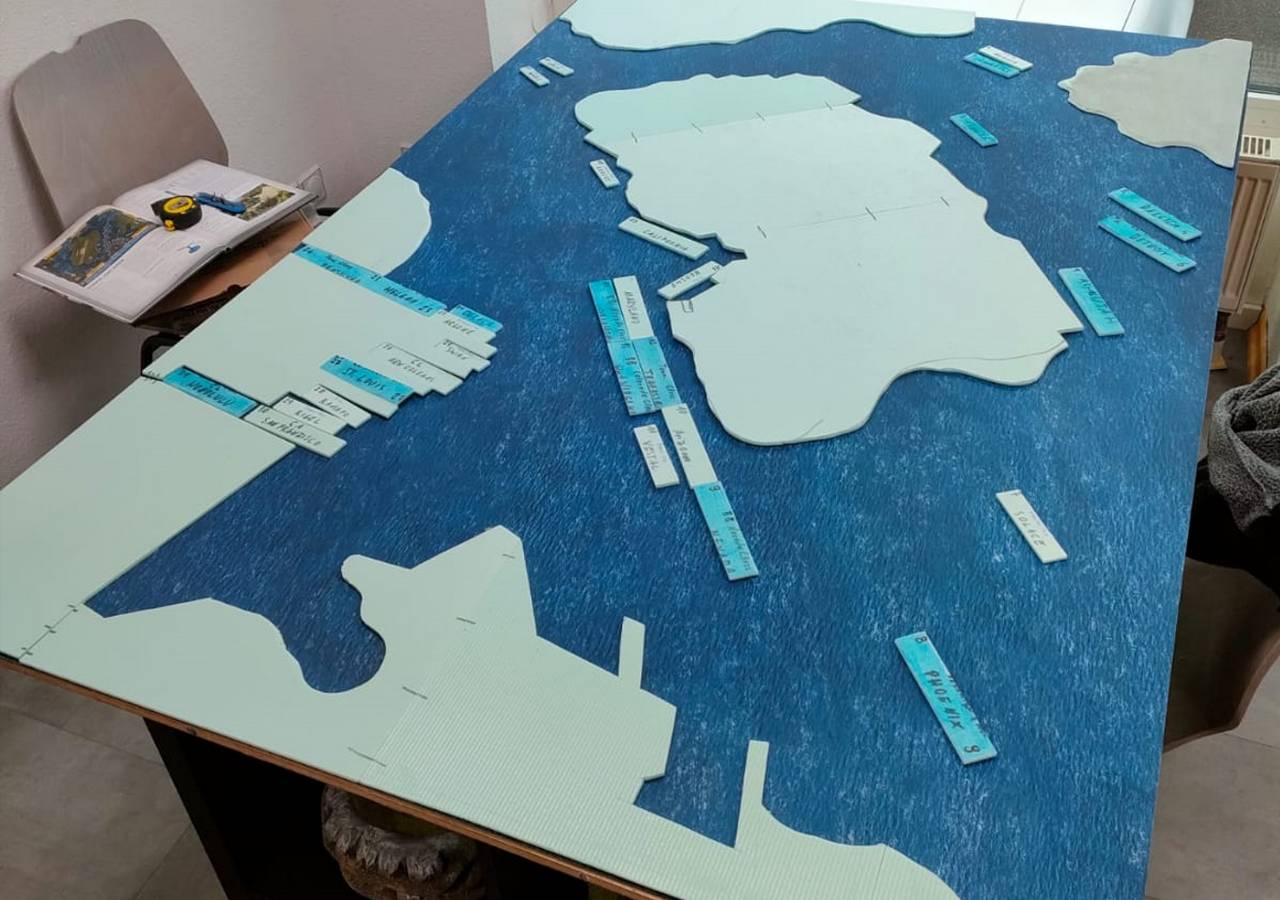 Das letzte Foto zeigt bereits die Aufteilung der gesamten Festland- / Inselstücke. Es sind insgesamt sieben Teile, die aus Styrodur gefertigt sind. Sie wurden durch Übertragung der Festlandkonturen von einer Karte auf das Styrodur-Material und anschließendes Ausschneiden mit dem Bastelmesser hergestellt.