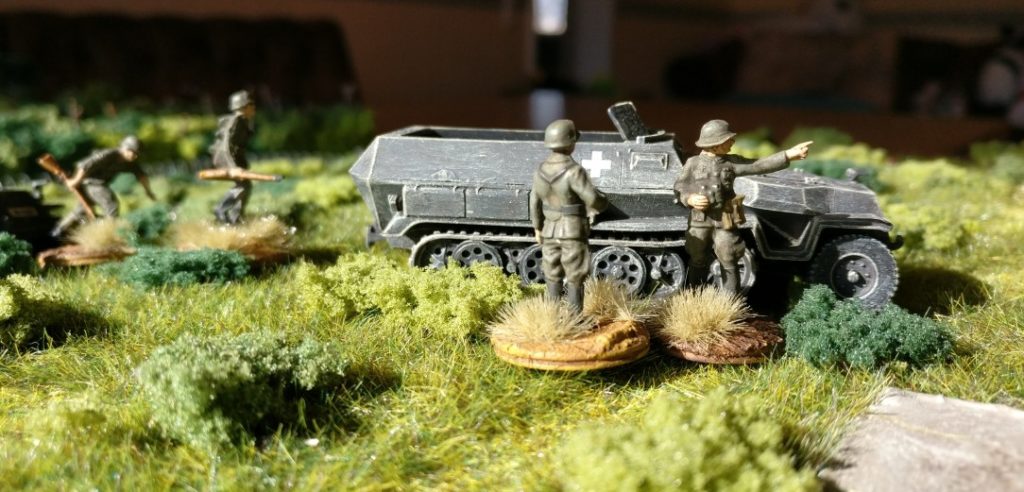 Für unsere deutsche Fraktion haben wir eigentlich die SPW von Plastic Soldier Company vorgesehen. Bei einem unserer letzten Hauls waren uns aber in der Bucht zwo Schachteln Italeri 7516 Sd.Kfz. 251/1 Ausf. C ins Netz gegangen. Naja, was soll man machen? Plasti hat sie übers Band laufen lassen und so kamen die vier SPW zum Schützen-Regiment 113. 9 weitere Sd.Kfz. 251/1 von PSC sind bereits in Produktion, so dass die mit vier SPW immer noch recht prekäre Versorgungslage beim Schützen-Regiment 1 der Wehrmacht bald behoben sein sollte. Stabsfeldwebel Kniffelsen jedenfalls hat munkeln hören, dass Nachschub im Anrollen ist.