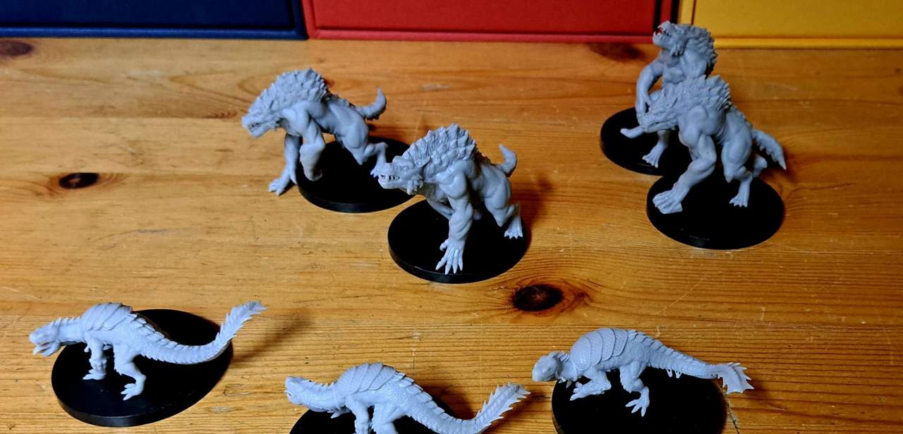 Drei Panzerechsen lungerten im Schatten der Carnodons. Veteranen leerer Lande, ausgehungert nach Schlacht und Ruhm. Auch sie schworen mir die Treue. Ihr Begrüßungsmahl: Zwergenbeine. Ein Biss. Weg. Wehe dem, der ihnen zu nahe kommt.