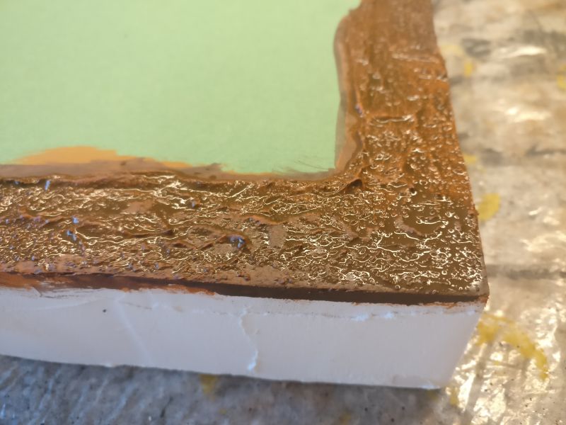Der Karton als Wasseroberfläche wurde mit Gelboliv behandelt. Die „Uferpartie“ wurde noch ausgespart. Sie wird nochmals separat behandelt.